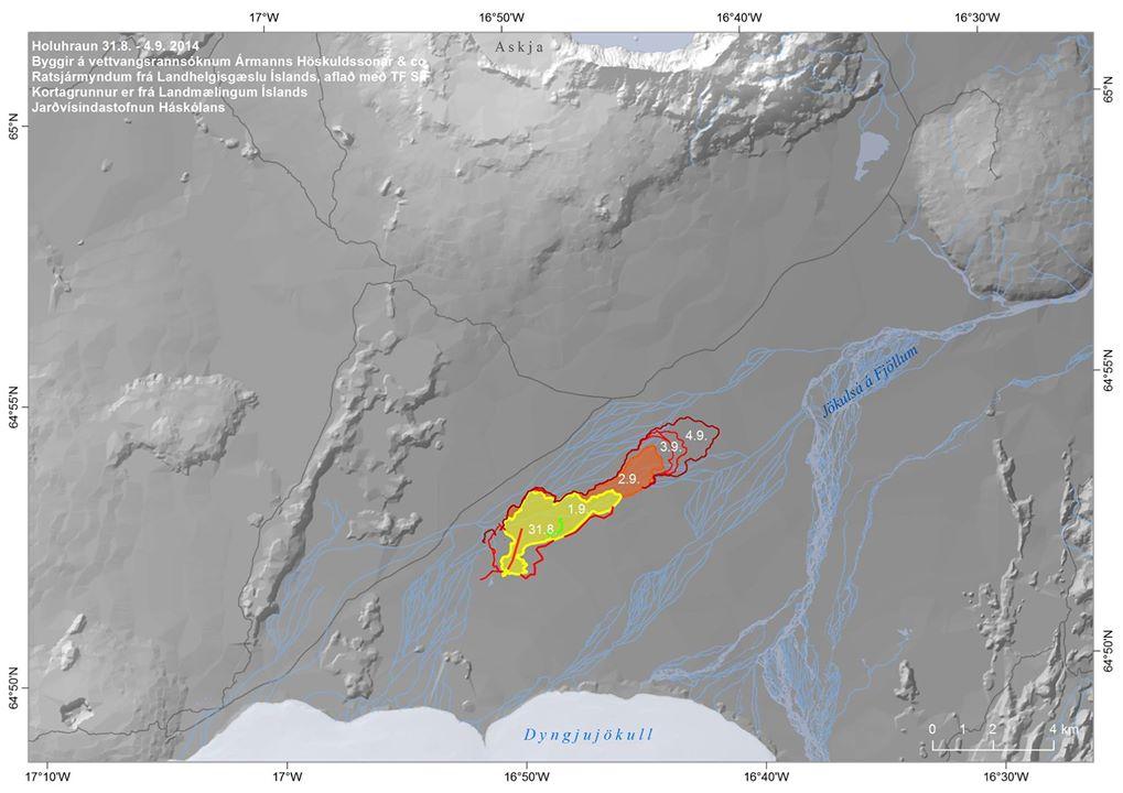 - Due nuove fessure eruttive si sono formate a sud del sito d'eruzione precedente nell' Holuhraun, in un graben, che si era formato sopra l'intrusione, a circa 2 km a nord dal ghiacciaio Dyngjujökull. (Vedi aggiornamento delle 19:29 del 3 Settembre)